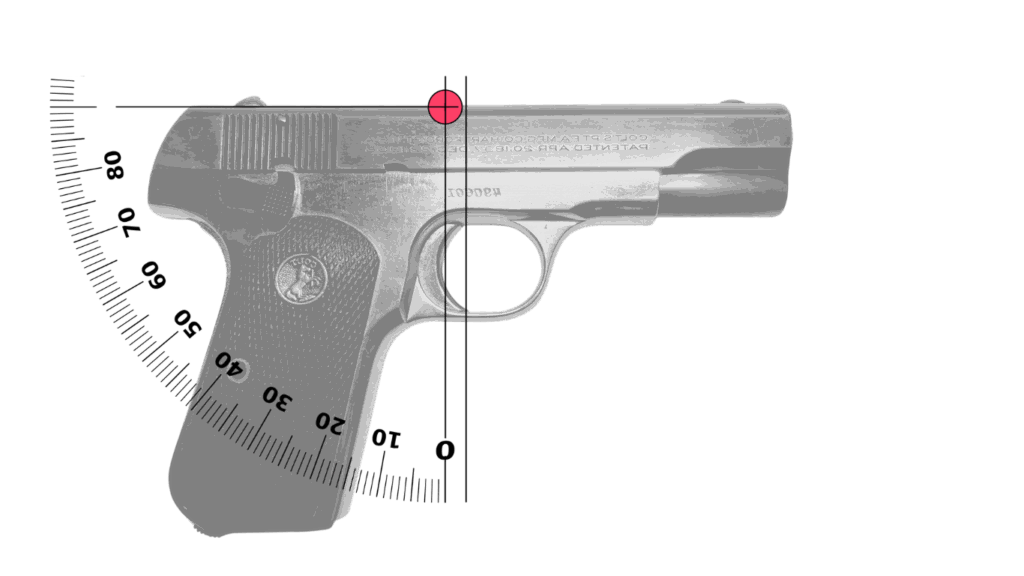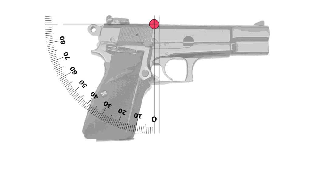 - Optimaler Grip-Angle ≈ 105–110° (Backstrap ↔ Visierlinie) — in der Praxis hat sich ein moderat flacher Griffwinkel (bei Angabe als Backstrap-to-sight-line: ca. 105–110°, entspricht oft knapp 18° off-square bei der 1911) als ergonomischer Kompromiss zwischen natürlichem Point-of-Aim und Rückstoßkontrolle durchgesetzt. Hersteller orientieren sich daran: 1911-ähnliche Designs ≈110°, Hi-Power-ähnliche Designs ≈105–108°.